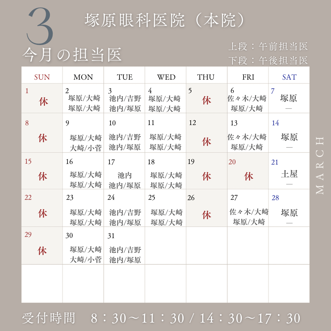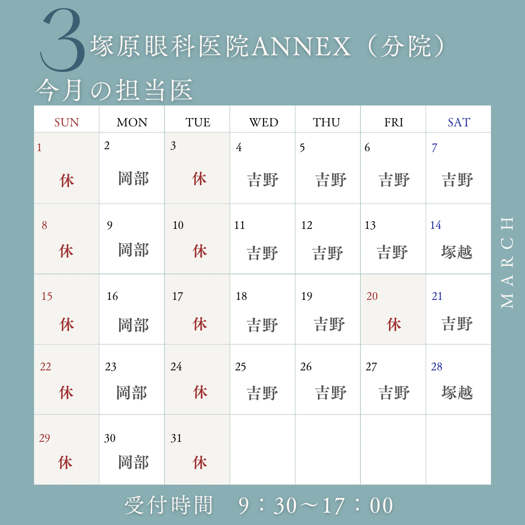 3月の診療案内(本院/ANNEX)NEW2026-02-16 *担当医のご指名は受付時にお伝えください。 *女性医師希望の方は佐々木・塚越・大崎・池内の時間帯にお越しください。 *水曜午後は、塚原院長の診察は17時までになります。